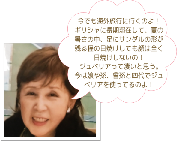 『今でも海外旅行に行くのよ! ギリシャに長期滞在して夏の暑さの中、足にサンダルの形が残る程の日焼けしても顔は全く日焼けしないの、ジュベリアって凄いと思う。今は娘や孫、曾孫と四代でジュベリアを使ってます。』